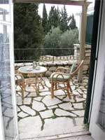 French windows lead to a spacious stone terrace, which is perfectly safe for small children. There is magical sea view through and over the trees. |
